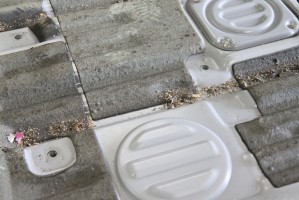 マットやカーペットを剥がしてみるとシートレール内部やその付近にゴミや汚れが酷い。