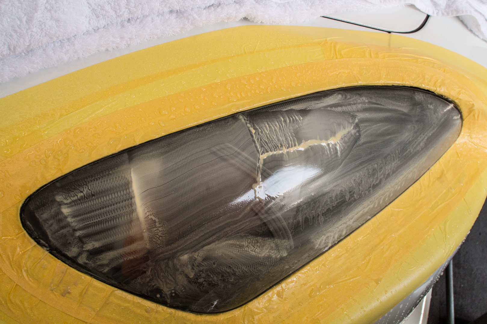 ヘッドライトのレンズカバーはかなりの傷み。劣化部分を削り、丹念に磨きあげる。